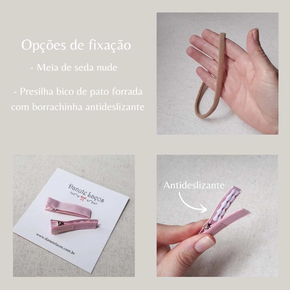 Fixação: Presilha forrada / Faixinha nude.